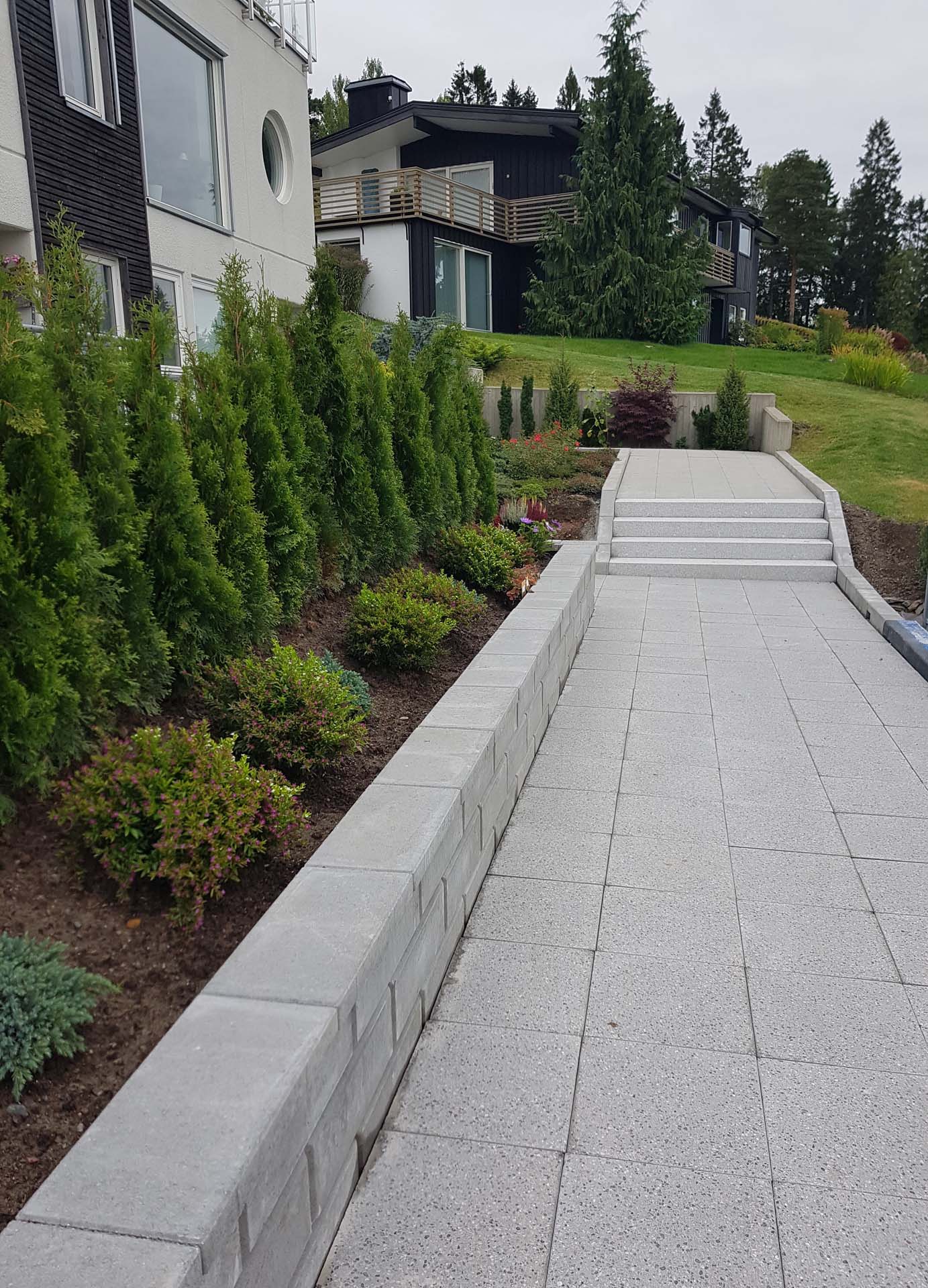 Vi leverer betongmurer, granittmurer, stablesteinsmurer og elementer for etablering av trapper.